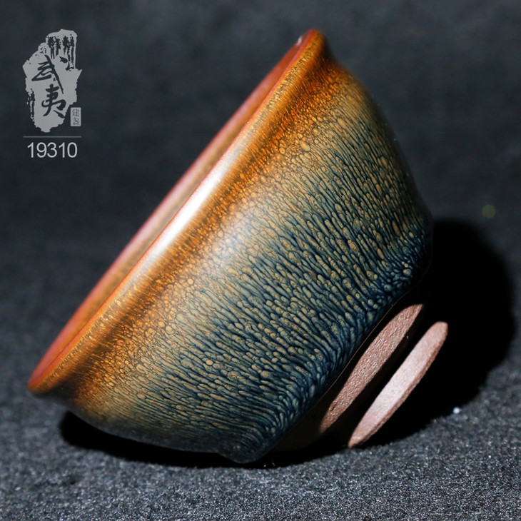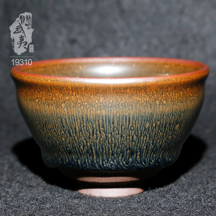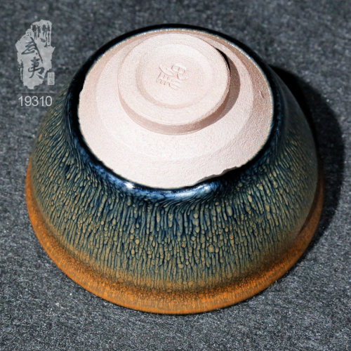 叶礼旺专注兔毫盏技艺研究多年,传承宋代生胚上釉、地方原矿釉和草木灰配釉的传统工艺。烧制的兔毫盏胎土纯正,釉色温润,器型优雅,兔毫斑纹清晰密布,丝丝相连,尤其擅长大盏的制作。古法技艺下产出的兔毫盏,毫丝立体,铁胎独特,干口有度,与宋代兔毫盏极为相似,曾被授予“优秀宋盏制作人”的称号。